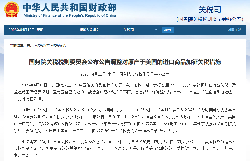 重要提示:自4月12日起对美关税税率提高至125%,后续美方加税将不予理会